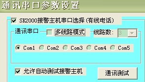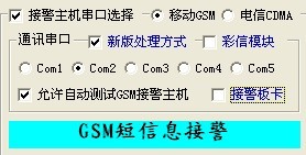 接警软件的通讯串口需选择正确,在接警软件系统里面的通讯设置,必须把‘新版处理方式’、‘彩信模块’、‘接警版卡’三项须全部选上。如下图所示: