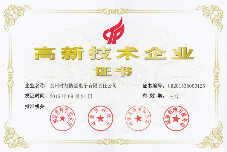 热烈庆祝我司再度通过“国家高新技术企业”认证,技术是企业第一生命力,我们将持续秉承“与时俱进、时刻创新”的方针,争创报警行业第一品牌。