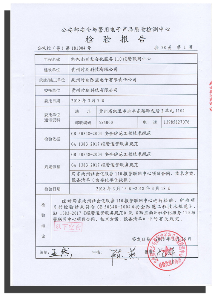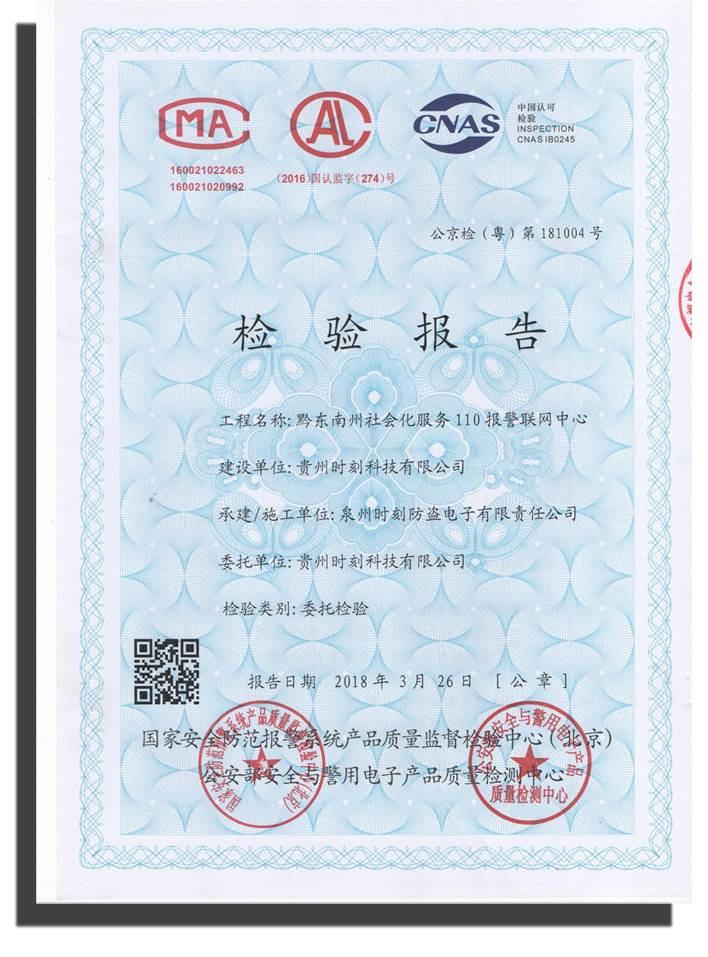 2018年3月,我司“承建黔东南州社会化服务110报警联网中心”通过“国家安全防范系统产品质量监督检验中心”和“公安部安全与警用电子产品质量检测中心”检验并获得证书。