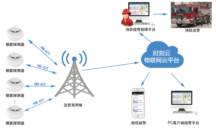 联网报警:采用最新NB-IoT通信技术,遇到烟雾主机现场高分贝报警、同时报警信息上报微信或联网报警中心平台