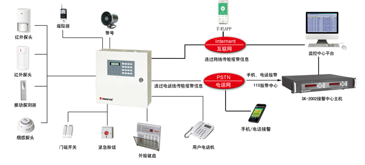 • PSTN&Internet双网传输报警信息,可存储8组报警电话号码,固定电话、移动电话、联网接警中心接警