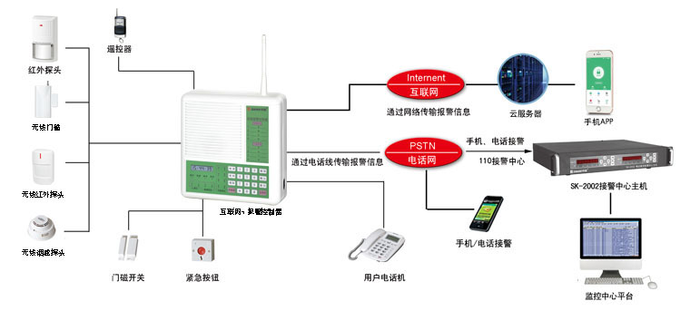 ●PSTN&Internet双网传输警情,固定电话、移动电话、联网报警中心及手机APP接收报警信息。